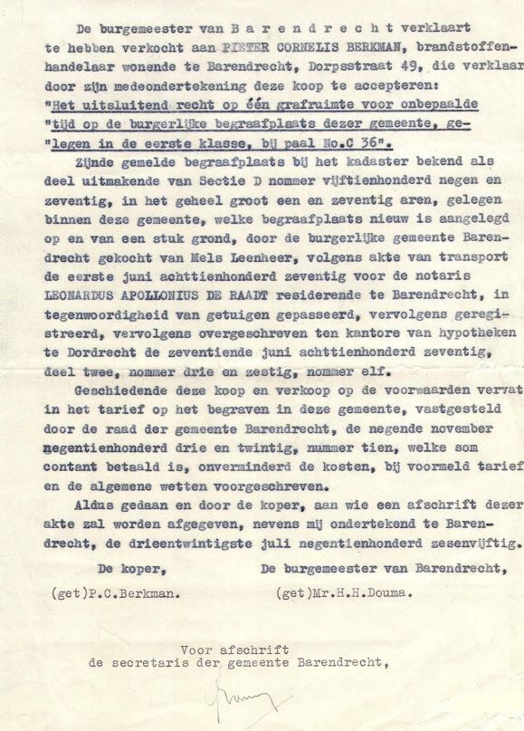 Verkoopacte van het graf C36 in de Gemeente Barendrecht aan Pieter Cornelis Berkman.