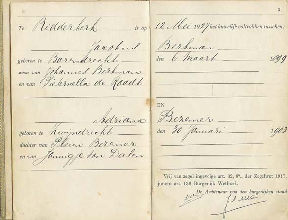 Trouwboekje van Jacobus Berkman en Adriana Bezemer 6-3-1899 Bladzijde 2 en 3.