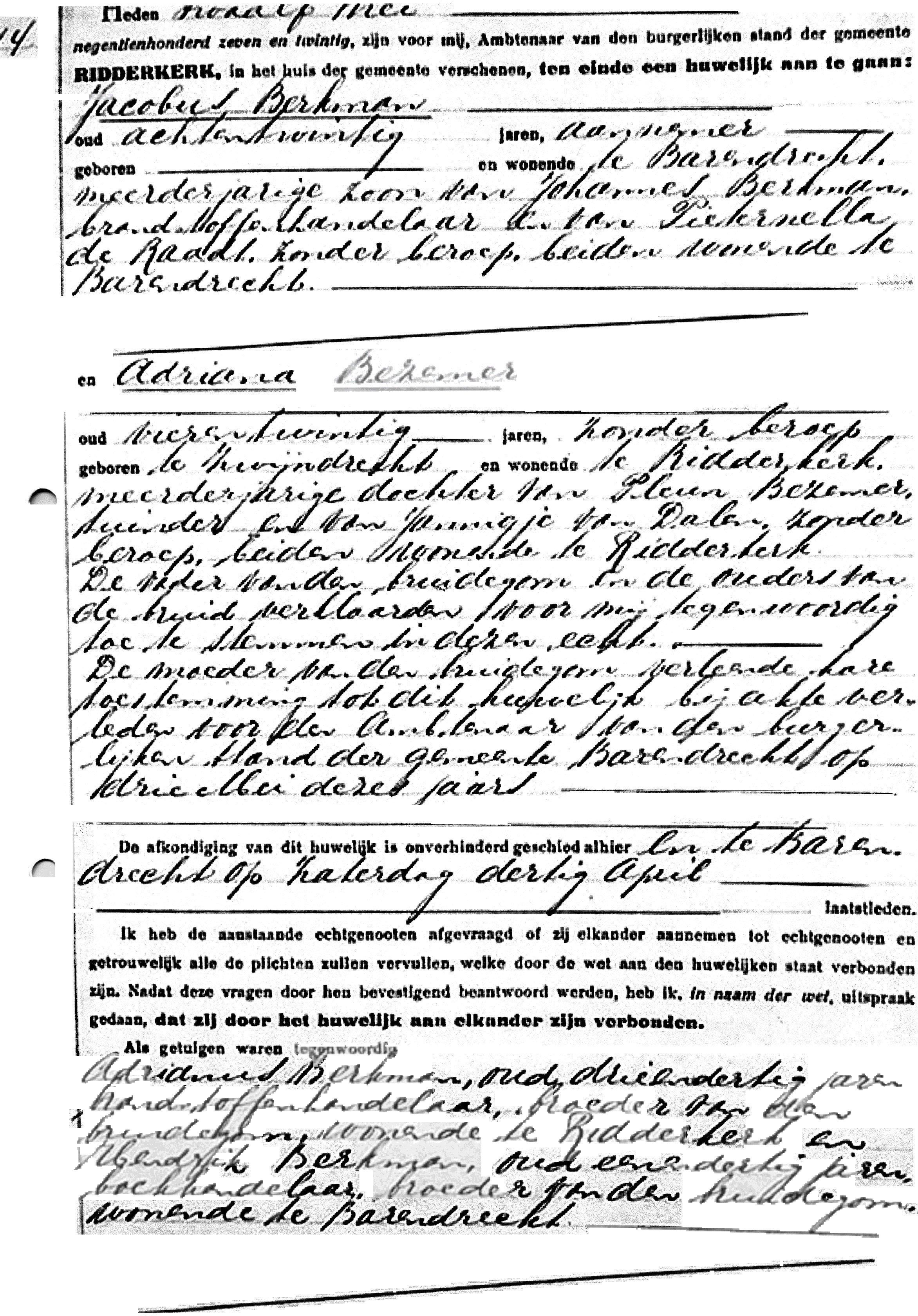 Trouwacte Jacobus en Adriana Bezemer. Jacobus zoon van Johannes Berkman en Pieternella de Raadt. Adriana Bezemer is een dochter van Pleun Bezemer en Jannigje van Dalen.