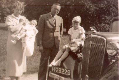 Hans (baby) en Jo voorop de Chevrolet omstreeks 1939.
