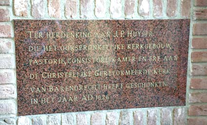 Gedenksteen ingemetseld in de nieuwe Christelijke Gereformeerde Kerk te Barendrecht.