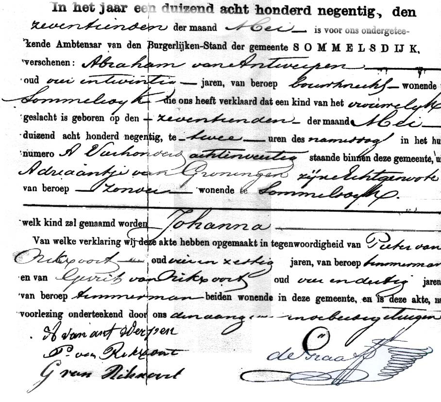Birth-certificate Johanna van Antwerpen * Sommelsdijk NL 5-17-1890