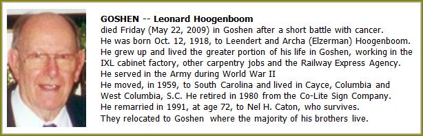 Leonard Hoogenboom * Detroit MI 10-12-1918 † Goshen